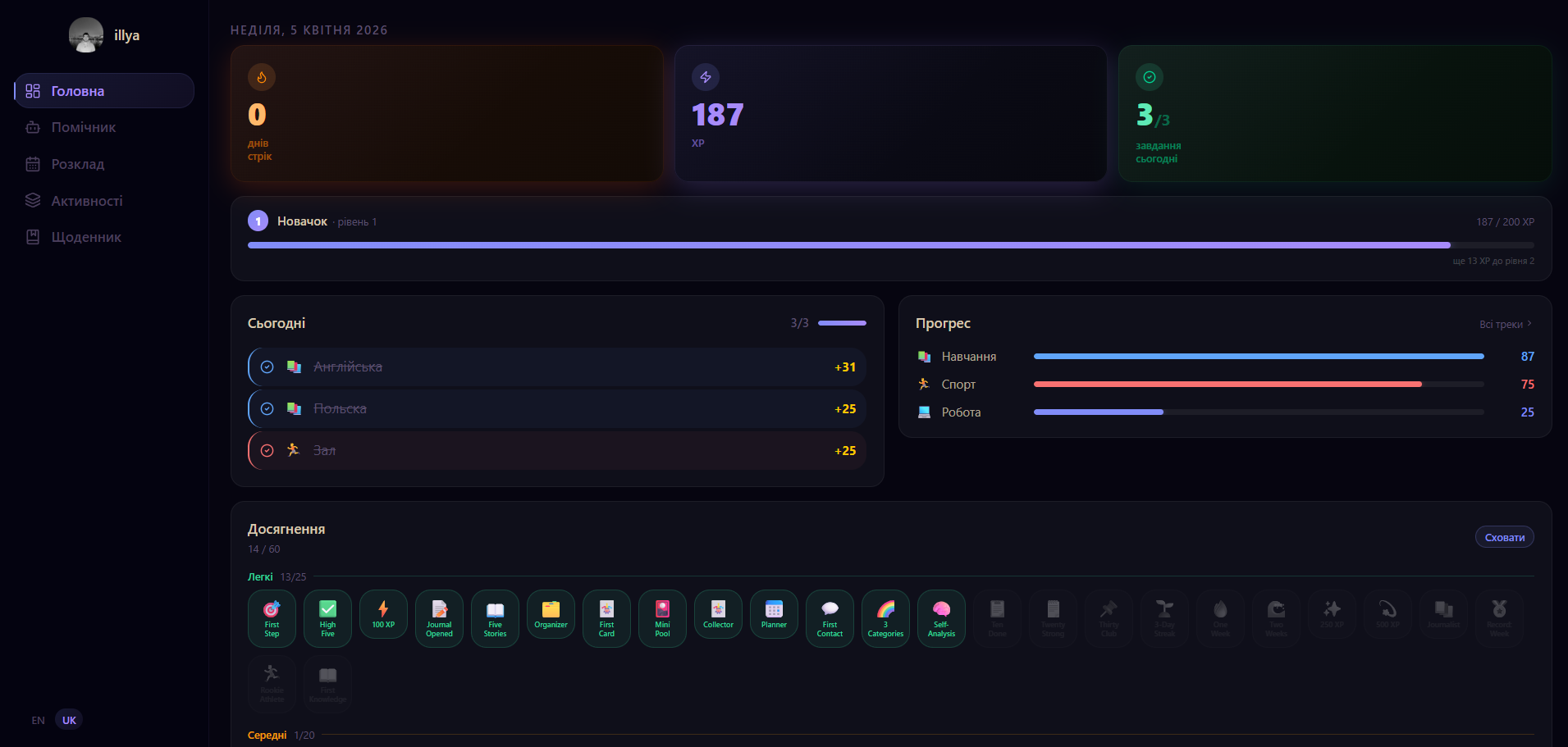 Streaks, XP, badges. Progress feels visible and earned — not like willpower grinding every morning.